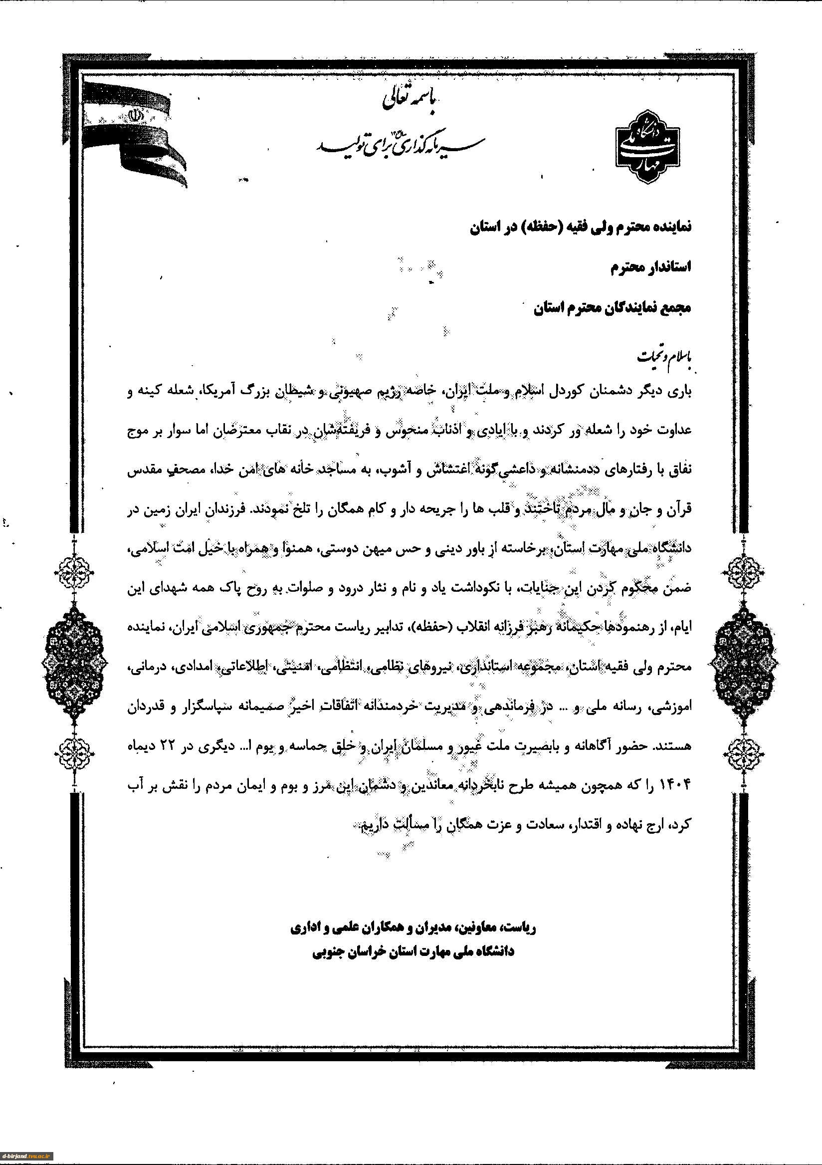 بیانیه دانشگاه ملی مهارت استان خراسان جنوبی در خصوص خلق حماسه 22دی ماه  1404 2
